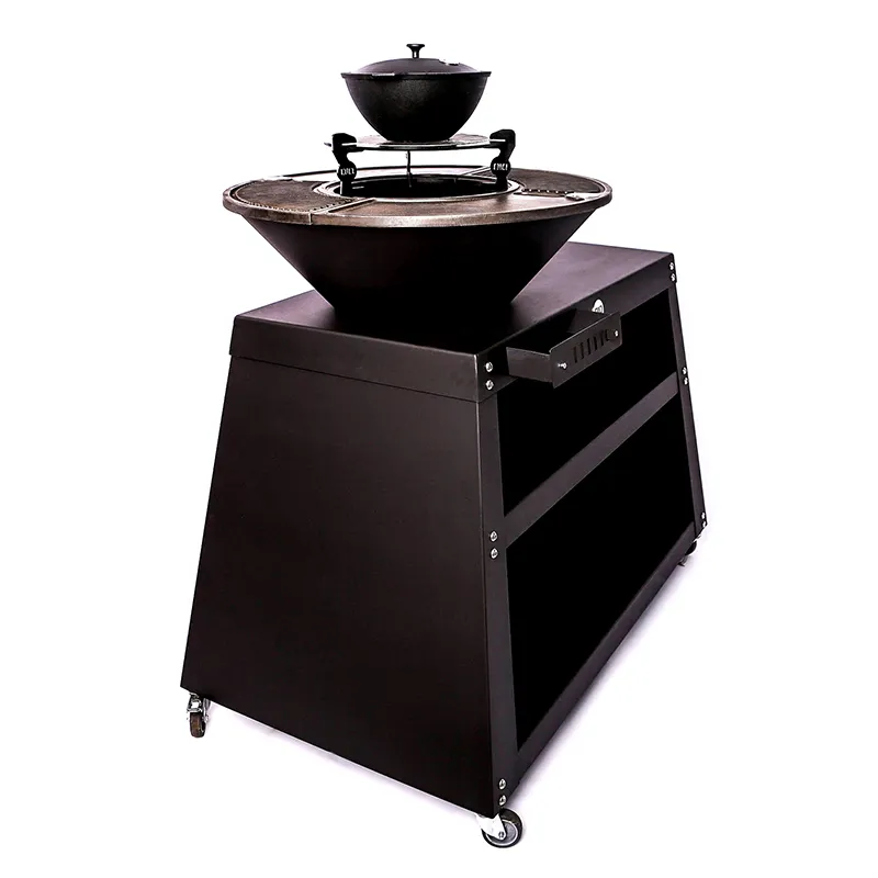 - Чугунная жарочная поверхность диаметром 750 мм. Изготовлена с использованием элементов из дерева и нержавеющей стали.