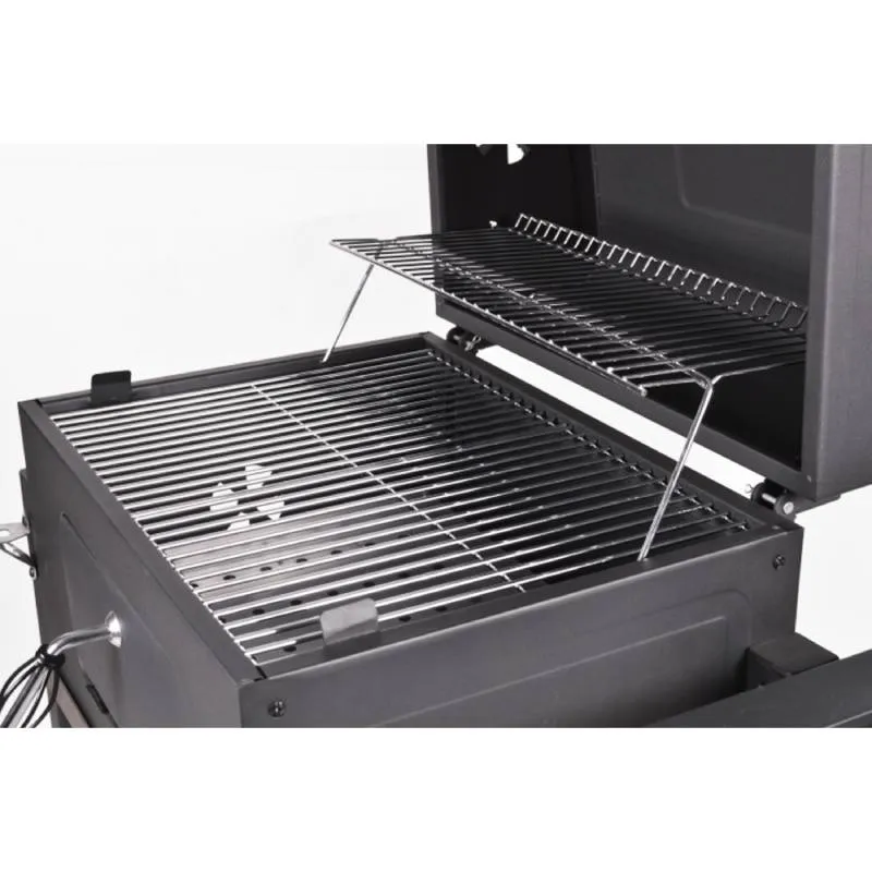 Угольный гриль, большой стационарный LOCKER с удобной боковой столешницей, открывалкой для бутылок и регулируемой по высоте угольной решеткой. Благодаря наличию полочек можно удобно расположить вспомогательные элементы и продукты для приготовления еды. Данная модель имеет два колеса для передвижения конструкции. На крышке есть термостат, который помогает контролировать температуру приготовления блюда.
