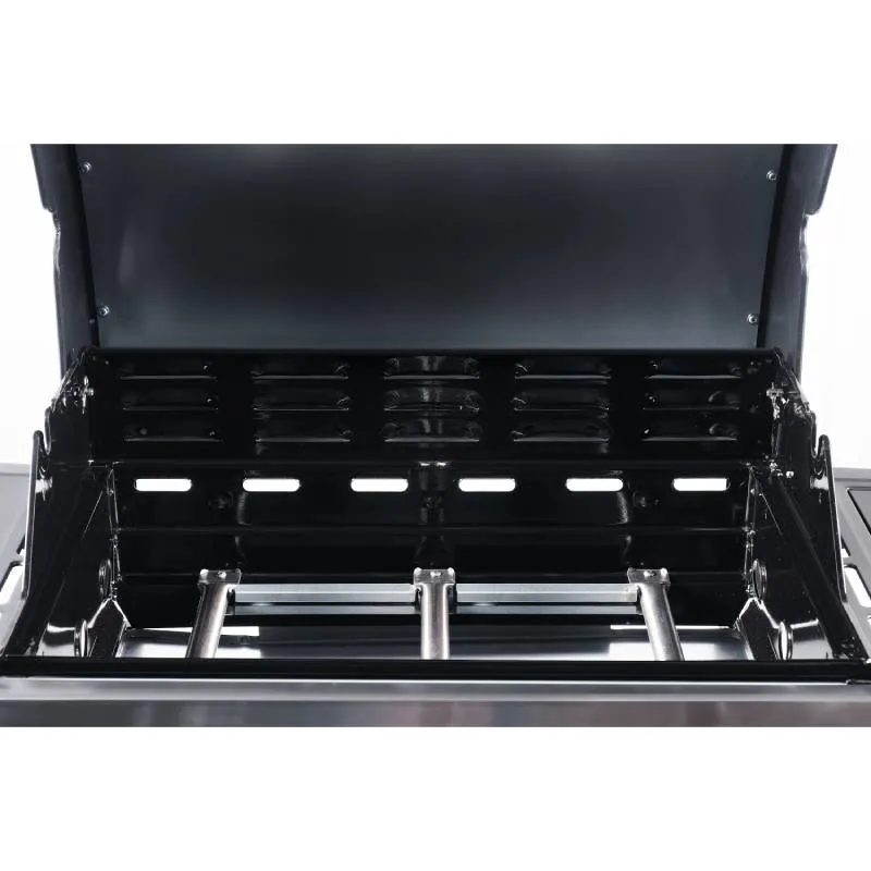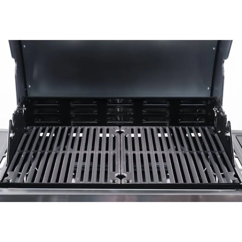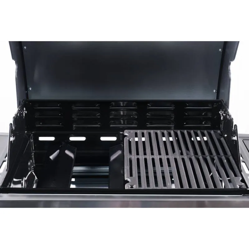 Дополнительная решетка для подогрева позволит сохранить вашу пищу теплой, а дополнительная горелка, встроенная в боковой столик, позволит приготовить различные соусы.