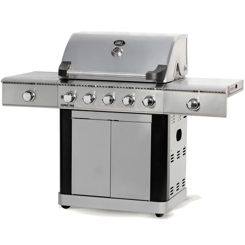 Ярким преимуществом модели Esprit Pro является наличие 5 горелок, которые обеспечивают равномерное распределение тепла. Инфракрасная ветроустойчивая левая боковая горелка разогревается до 800°C и гарантирует идеальную прожарку мяса в любую погоду. Правая мощная боковая горелка прекрасно подойдет для приготовления фирменных соусов. Гриль укомплектован чугунными решетками для приготовления, чугунной планчей и решеткой для подогрева.