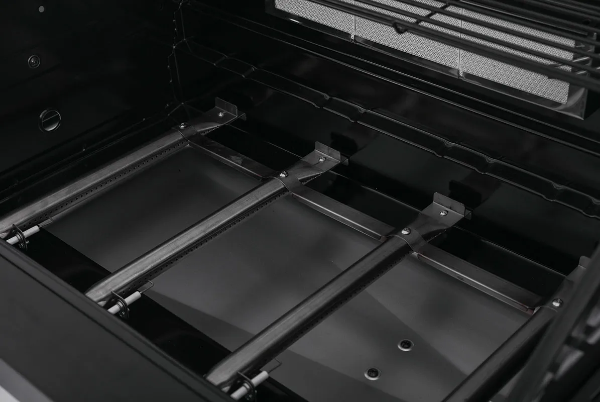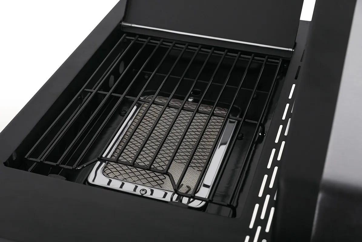 Гриль имеет четыре основные горелки, две дополнительные инфракрасные горелки и большую площадь жарочной поверхности. Это обеспечивает равномерное распределение основного тепла и быстрое нагревание инфракрасной горелки до 800°C для экспресс-обжарки мяса.