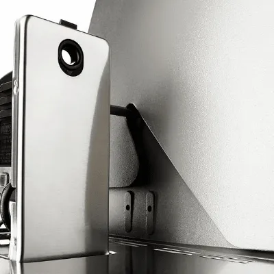 • Двустенная крышка из высококачественной стали с полированными ручками и декоративной планкой, вмонтированным в центр термометром и подобранными по цвету боковыми частями из алюминиевого литья