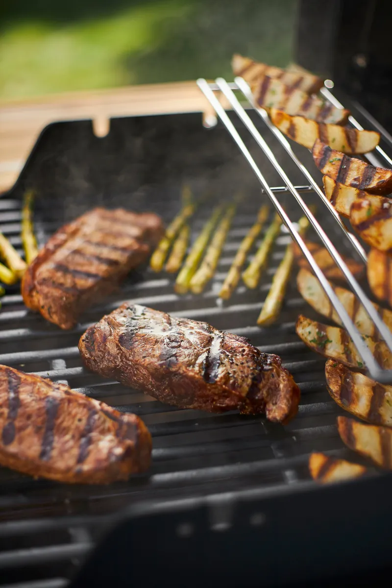 Три мощные горелки и большая зона приготовления этого гриля позволят разом накормить целую семью. Боковые столики удобны для сервировки блюд, а на крючки для инструментов можно повесить щипцы и лопатку, чтобы все самое необходимое было под рукой.