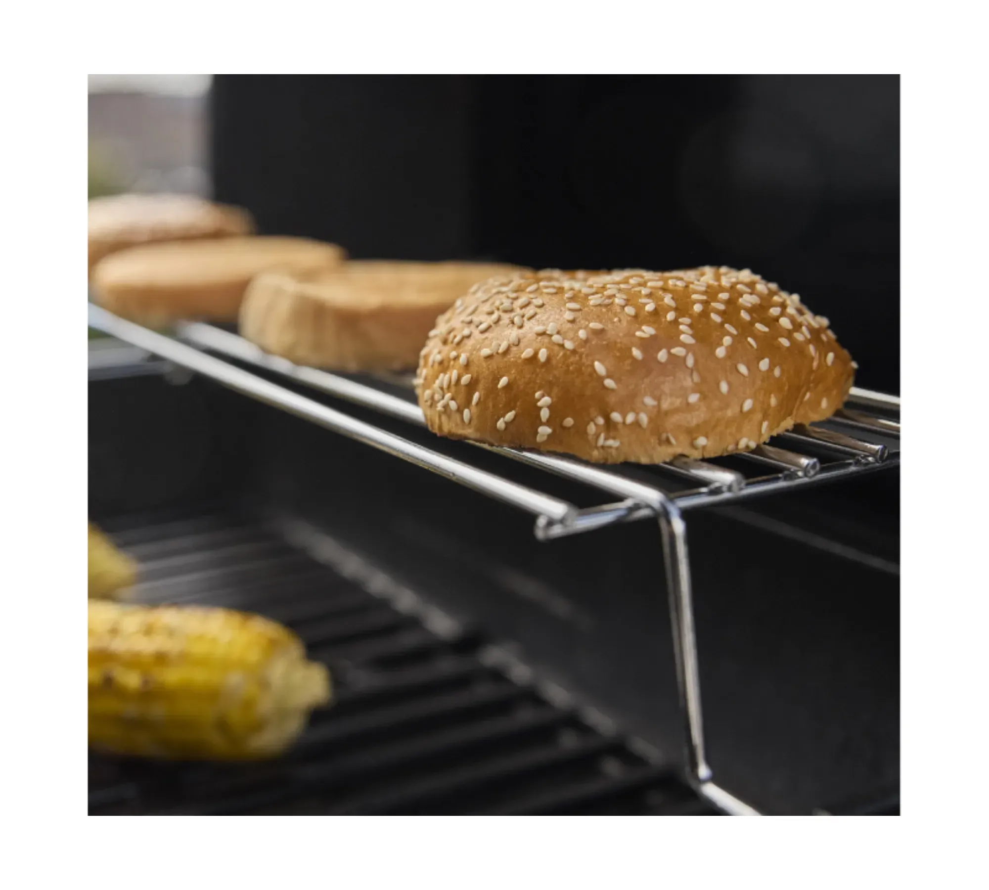 - Решетка для подогрева и допекания сохраняет еду теплой, поджаривает булочки или даже готовит на гриле небольшие продукты, пока основное блюдо доготавливается на решетках внизу.