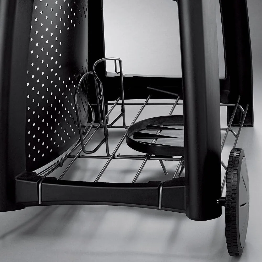 Два универсальных стола газового гриля Weber Q со встроенными держателями инструмента компактно убираются в гриль.