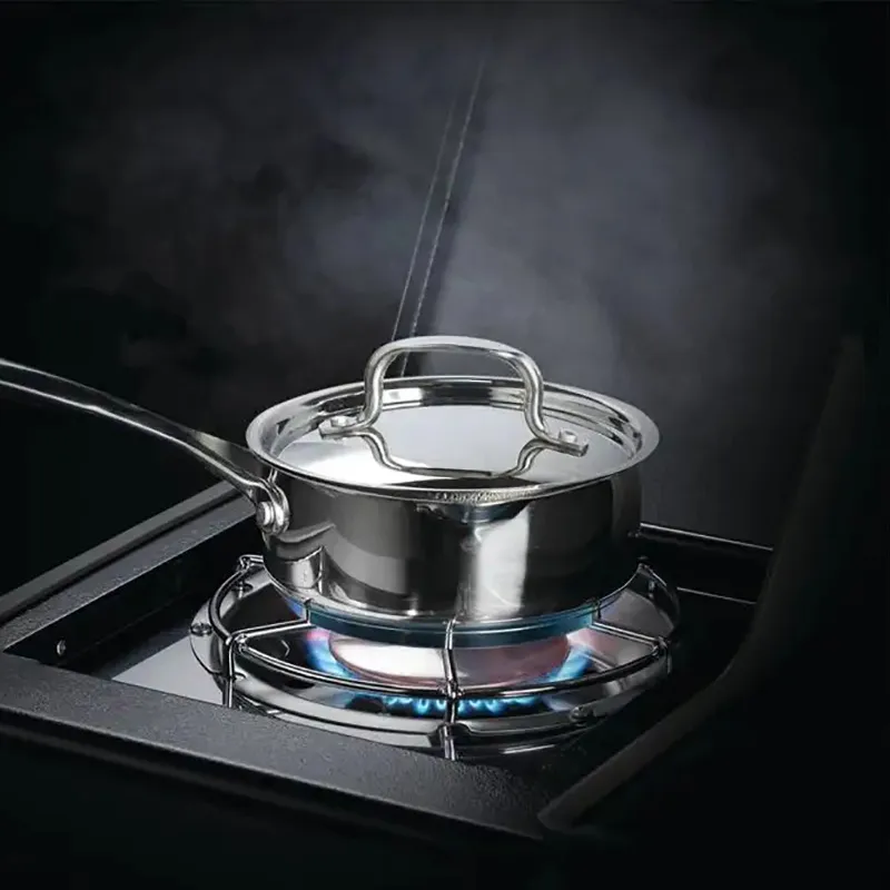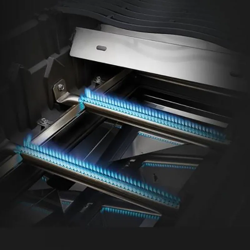3 мощные основные горелки с системой пьезоэлектрического розжига, прикрытые сдвоенными рассекателями для более равномерного распределения жара