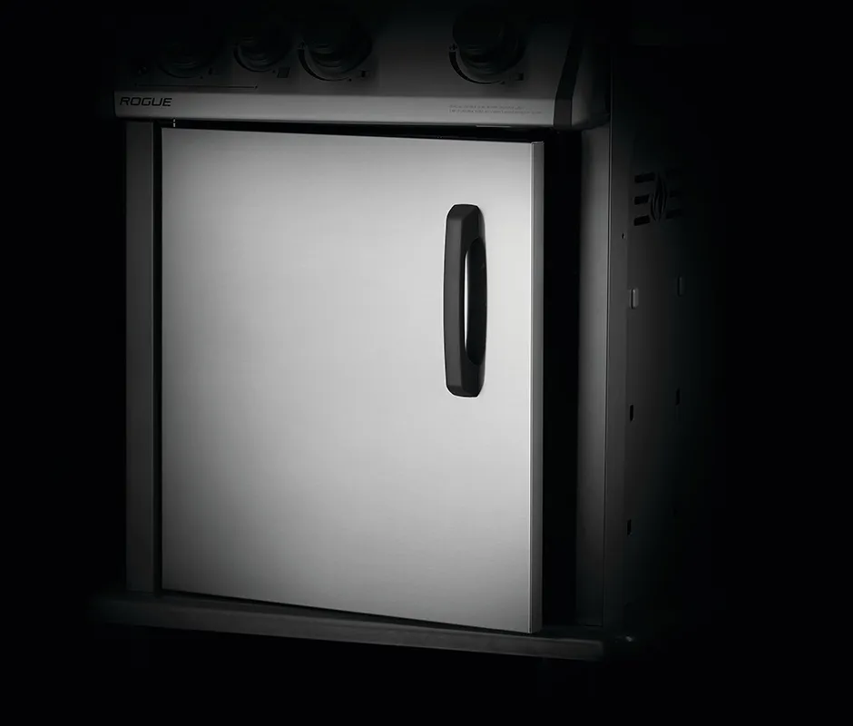Фасад основания закрыт дверками из нержавеющей стали, за которыми располагаются поддон из нержавеющей стали и лоток со сменным вкладышем для сбора жира. В свободном пространстве можно разместить аксессуары, а установленный здесь же газовый баллон не изменит внешний вид гриля и ваш ROUGE 425 SE всегда будет выглядеть эстетично!