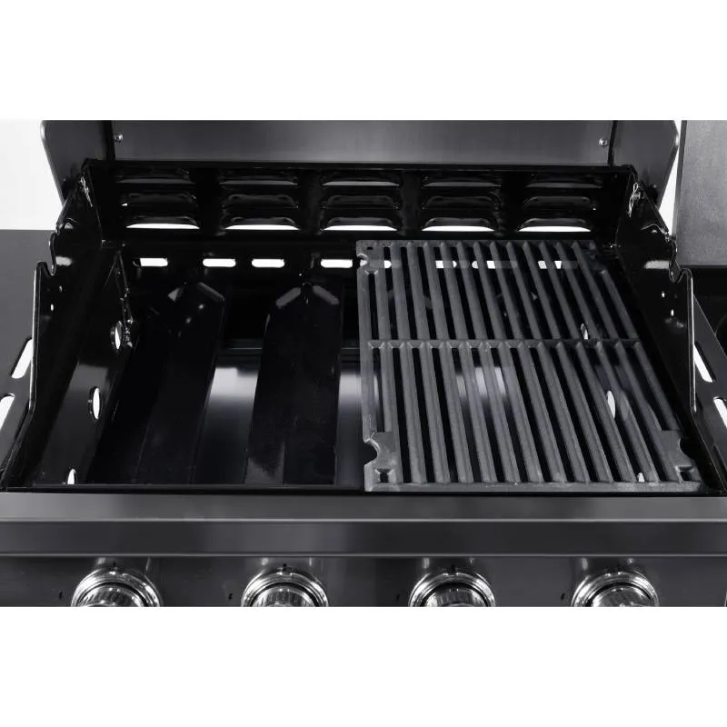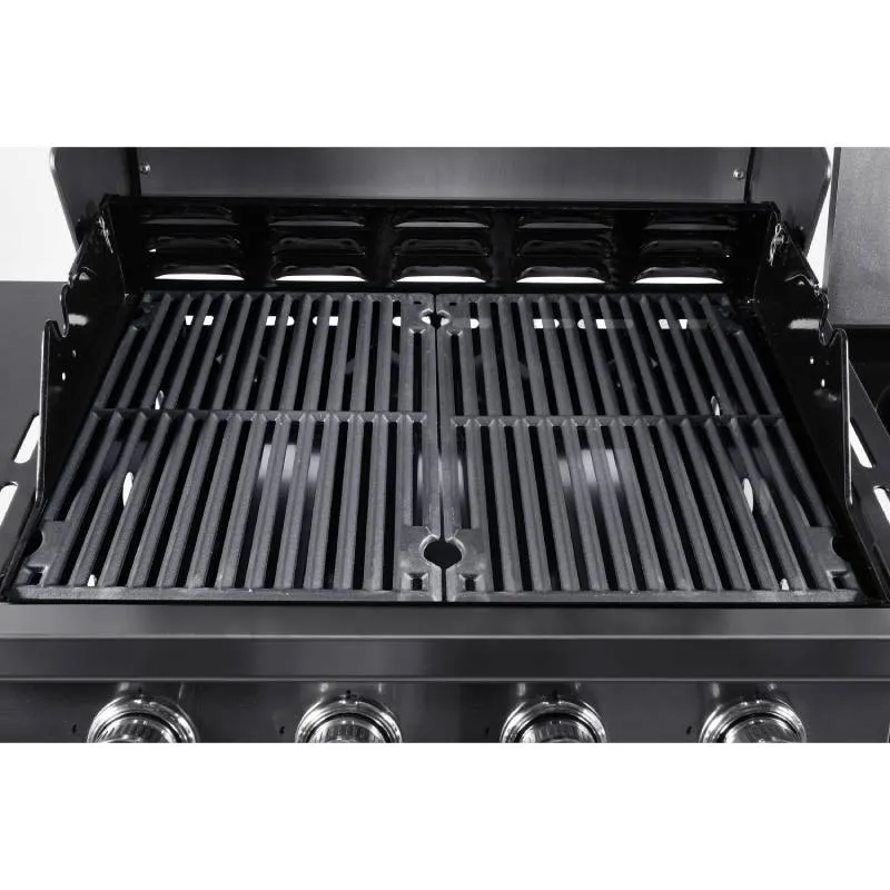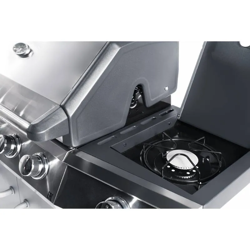 Дополнительная решетка для подогрева позволит сохранить вашу пищу теплой, а дополнительная горелка, встроенная в боковой столик, позволит приготовить различные соусы.