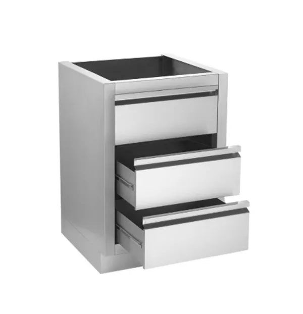 Оснащена двумя выдвижными ящиками с доводчиками, в которых можно хранить посуду, специи и аксессуары для гриля.
