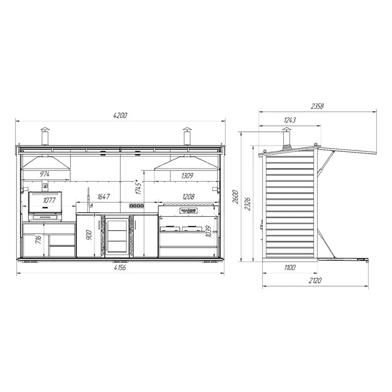 Гриль-зона “Гурман” не займет много места благодаря своим компактным размерам: ширина 4,2 м, высота 2,6 м, глубина 1,1 м.