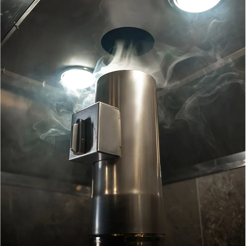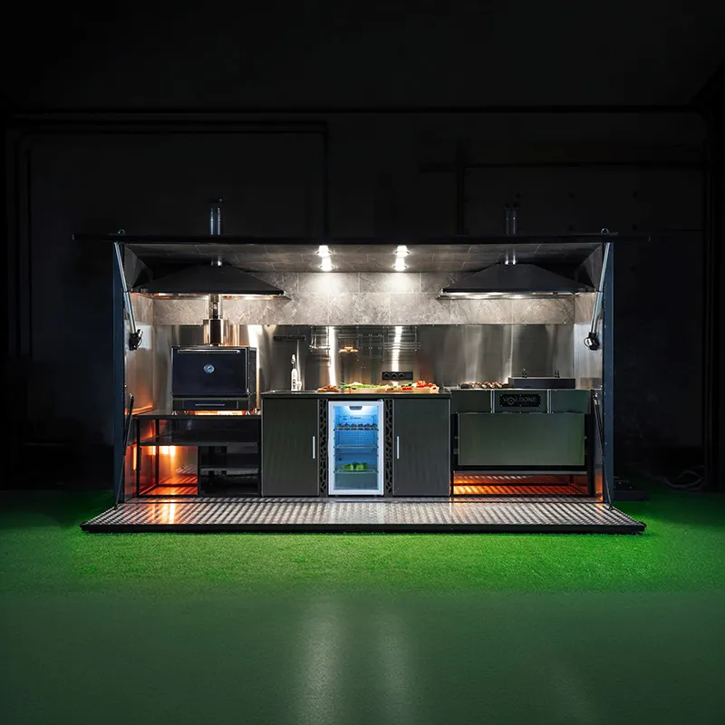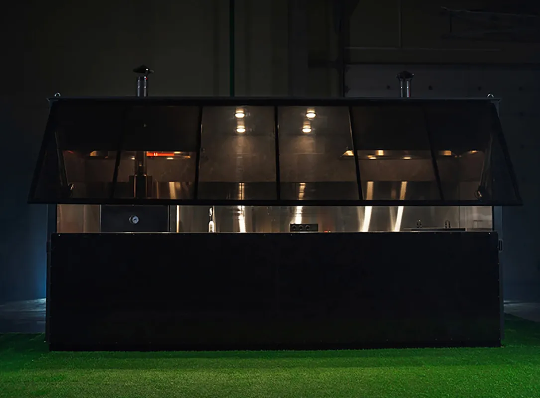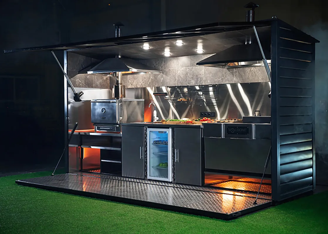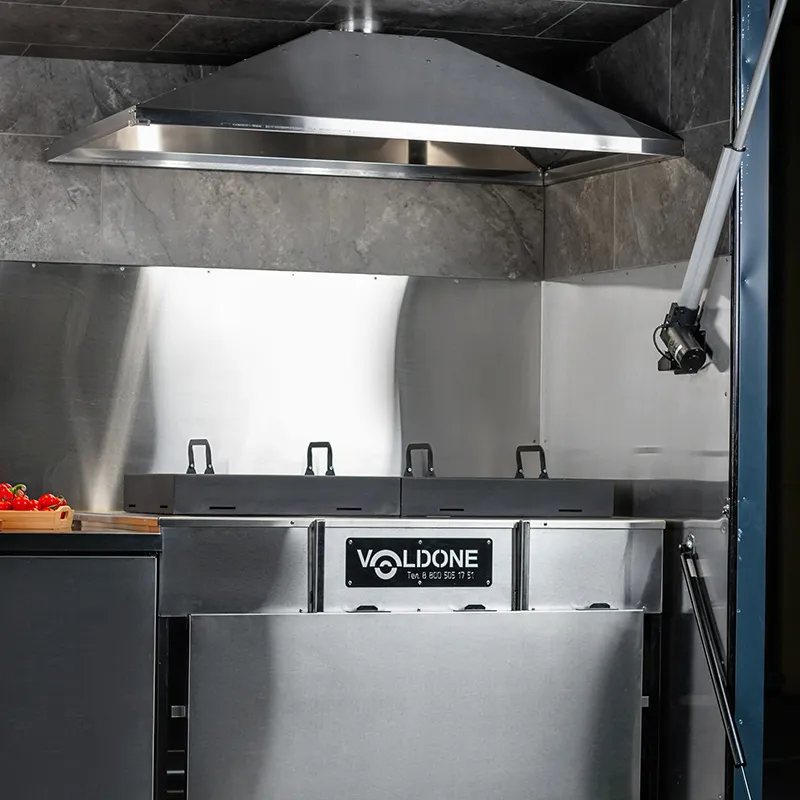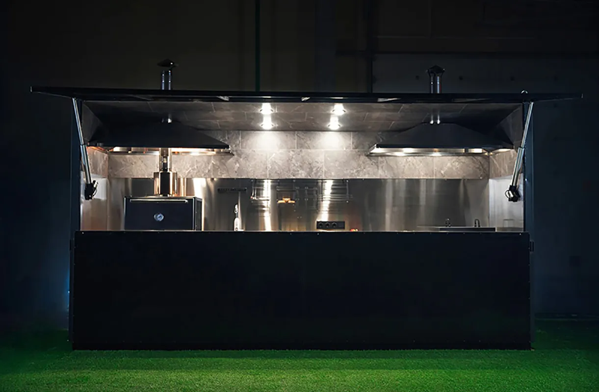 Каждый модуль имеет индивидуальное освещение и включает вытяжные зонты с дымоходами для избавления от лишнего жара и дыма. Основные поверхности выполнены из нержавеющей пищевой стали.
