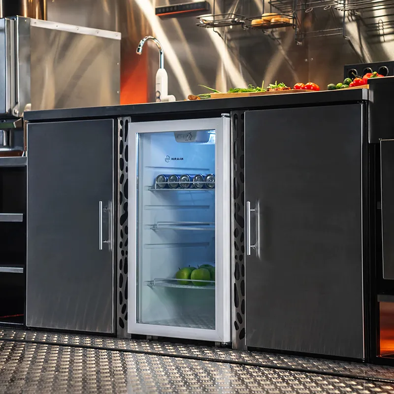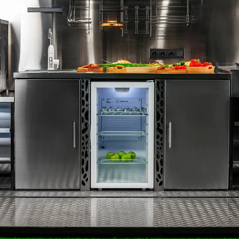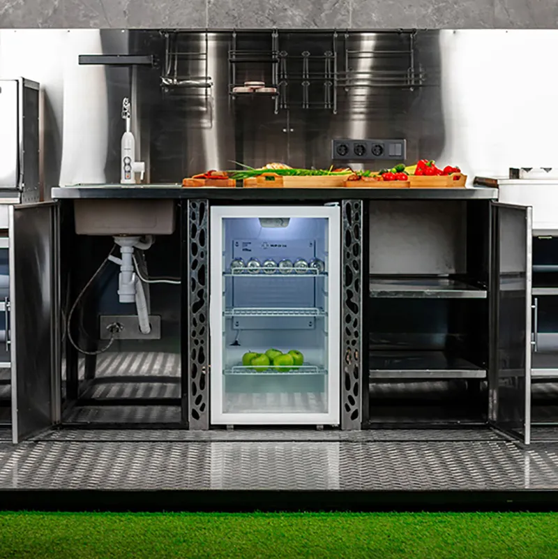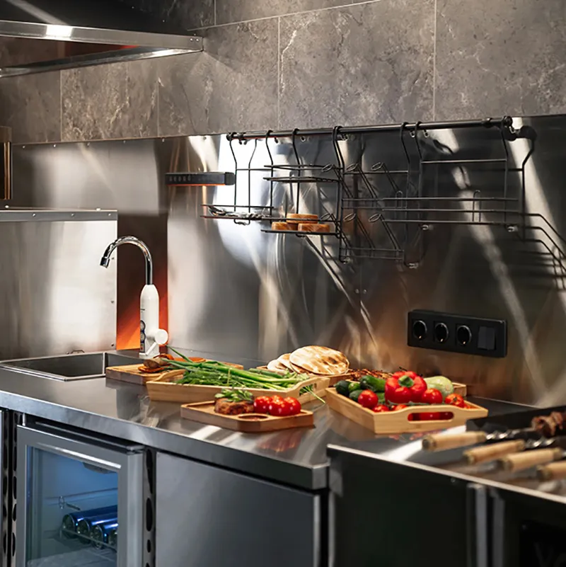 Соседствующий модуль с рабочим столом для нарезки, встроенной мойкой и холодильником призван облегчить весь процесс приготовления. Широкая поверхность стола изготавливается из высококачественных материалов, устойчивых к царапинам и воздействию высоких температур, что обеспечивает долгосрочную эксплуатацию без потери внешнего вида. Встроенный холодильник позволяет сохранять свежими ингредиенты или напитки, обеспечивая непрерывность процесса приготовления, а мойка с современным смесителем обеспечивает удобство и гигиеничность.