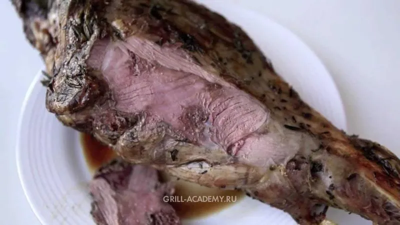 Баранью ногу нафаршировать со всех сторон анчоусами, вставить в те же отверстия веточки розмарина, шалфея и тимьяна, обложить ногу остальными травами и стянуть всё кулинарной нитью. Смазать чесночным маслом (оливковое масло + чеснок + травы + чёрный перец) со всех сторон, готовить на гриле с крышкой или в духовке при 170°C в течение 2 часов, смазав чесночным маслом и перевернув ногу 2 раза. Замерять температуру внутри самой толстой части ноги термометром для мяса: она не должна быть выше 60°C. Убрать с огня, закрыть со всех сторон фольгой, накрыть полотенцем, дать постоять 30 минут. Нарезать тонкими ломтиками, подавать с соусами (например, мятным) и овощами.