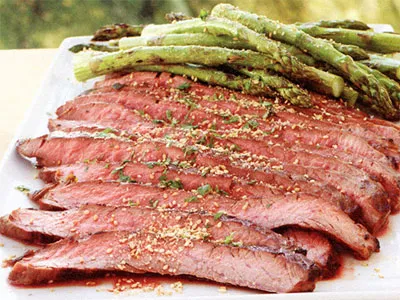 Фланк-стейк по-азиатски с зеленой спаржей и гомасио