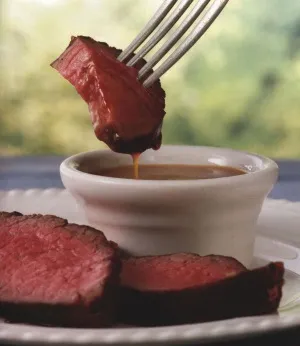 - Снимите мясо с огня, накройте фольгой и оставьте на 5-10 минут. Нарежьте тонкими ломтиками поперек волокон и подавайте на стол в теплом виде вместе с приготовленным соусом.