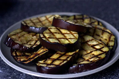 - Очистите решётку для гриля щёткой. Жарьте баклажаны в зоне среднего прямого жара под крышкой 6-8 минут до мягкости, пока на них не появится характерный узор от решёток гриля. Выложите на большое блюдо, полейте заправкой и подавайте на стол в тёплом виде.