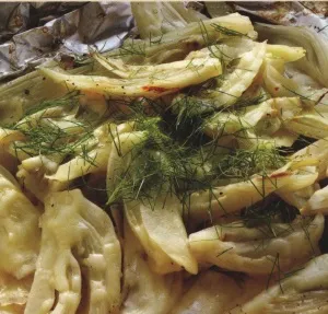 - Порезанный фенхель уложите толстым слоем на половину листа сверхпрочной алюминиевой фольги размером 30×60 см. Полейте фенхель маслом и соком лимона. Посолите и поперчите по вкусу. Накройте фенхель алюминиевой фольгой и тщательно закрепите пакет по краям, чтобы не вытекала жидкость.