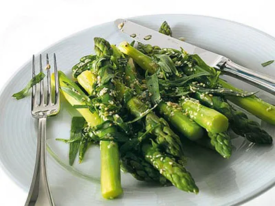 Зеленая спаржа со шпиком и винегретным соусом на основе хереса