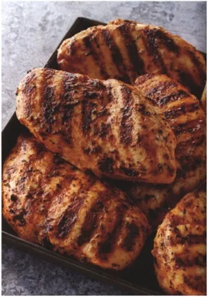 - Очистите решетку для гриля с помощью специальной металлической щетки. Положите грудки гладкой стороной на гриль и жарьте под крышкой в режиме прямого среднего жара приблизительно 8-12 минут до полной готовности, мясо должно быть плотной консистенции. Один или два раза переверните. Подавайте на стол в теплом виде.