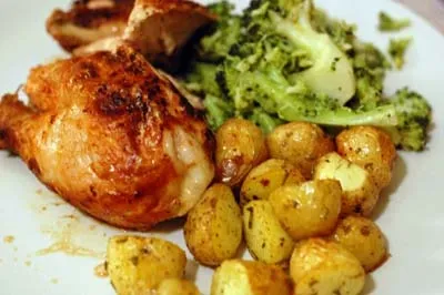 - Достаньте мясо из сковороды и проверьте степень готовности картофеля: картофель должен быть подрумяненным по краям и мягким внутри. Если картофель не готов, то оставьте его в зоне среднего прямого жара ещё на 5 минут, помешивая осторожно, чтобы он не развалился. Достаньте картофель из сковороды шумовкой и подавайте блюдо на стол в тёплом виде с куриными окорочками.