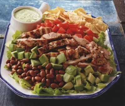 - На блюде разложите салат романо. Сверху, не перемешивая, выложите кусочки тортильи, томаты, авокадо и фасоль.