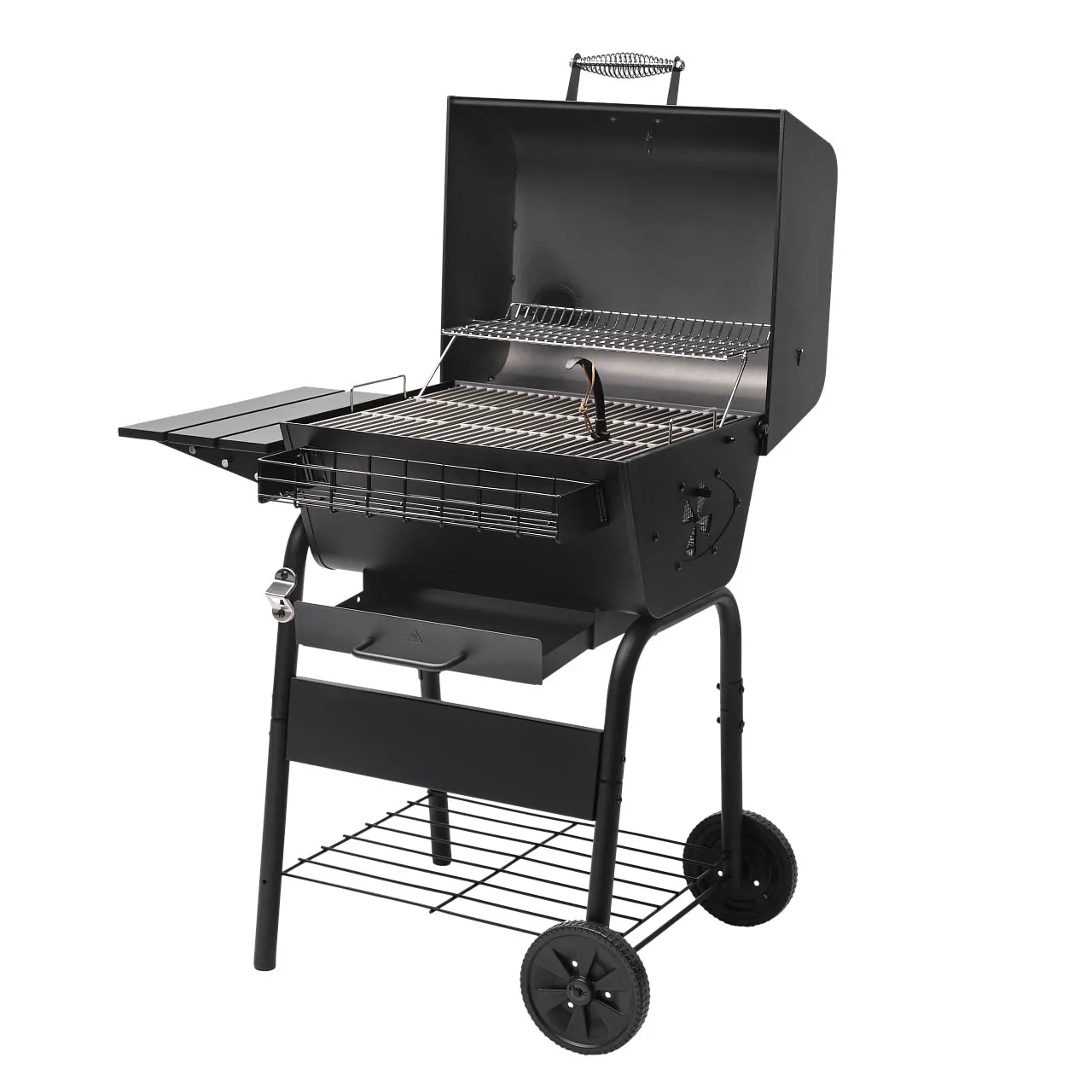 Гриль легко перемещать благодаря двум большим колёсам, а при остановке он устойчив за счёт двух прочных опор. Нижняя полка удобна для хранения угля, топлива и аксессуаров для готовки. А зольник, расположенный спереди, обеспечивает быструю и простую очистку после использования.