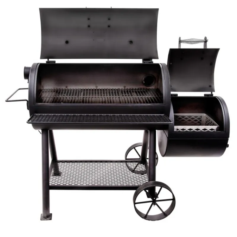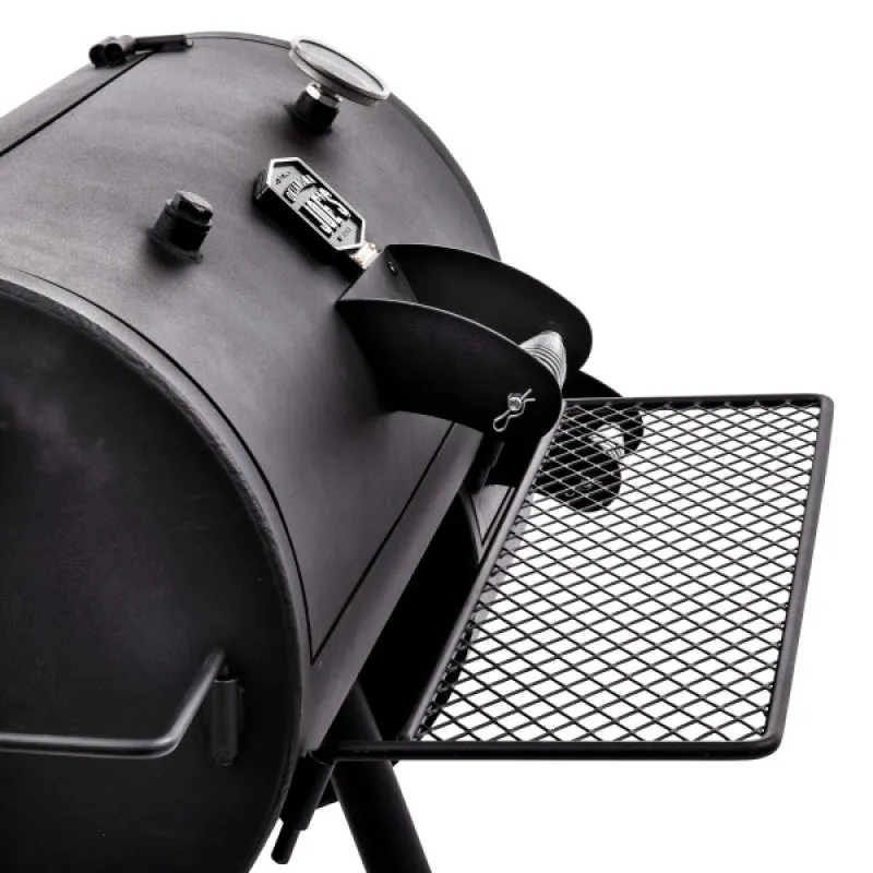 Выходную трубу можно установить с любой стороны, организовав как прямой поток (offset), так и реверсный. Установлены ненагревающиеся ручки на коптильной камере и на очаге. Просторная дополнительная полка на всю длину коптильной камеры. Термометр встроенный в крышку. Опционально есть возможность установить второй термометр.
