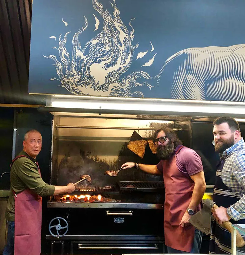 - Гриль с двумя регулируемыми по высоте решетками, стационарнои полкой для «отдыха» мяса и подвесными крюками для вяления мяса