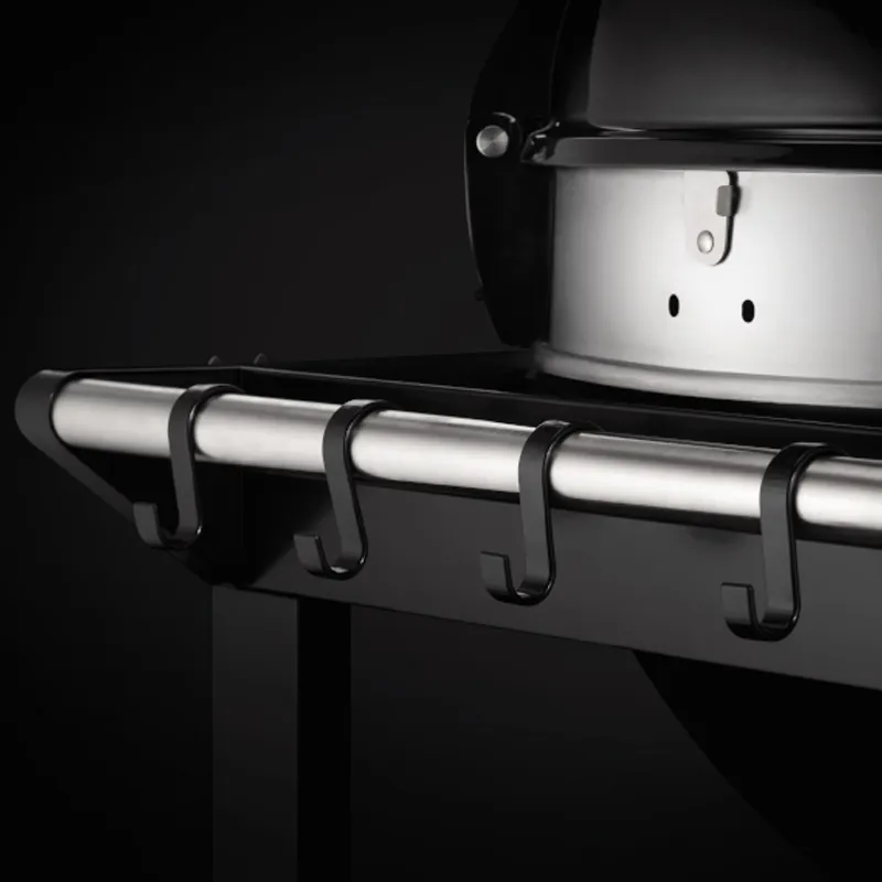 - Широкий, складной боковой столик с оцинкованной стали с порошковым покрытием и крючками для аксессуаров