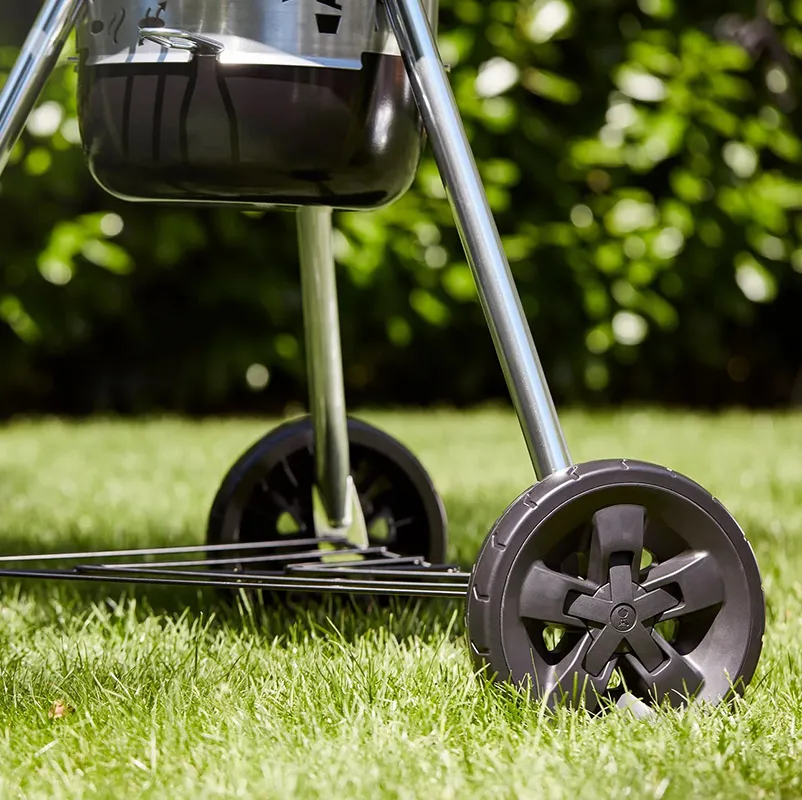 От более простых моделей гриль отличается высокой базой, что крайне удобно для человека высокого роста. К грилю не нужно наклоняться. Система очистки котла One-Touch со стальными лепестками, расположенными в нижней части котла, очищают гриль от пепла и остатков пищи. Управляется данная система выведенным на внешнюю часть котла рычагом. Герметичный пеплосборник позволяет использовать гриль на веранде, балконе и деревянном полу. В решетке для приготовления есть два откидных "ушка", через которые можно добавлять уголь, не снимая жаркого. Это очень удобно при запекании или копчении. Температура начинает падать и вы просто добавляете нужное количество угля. А на ручке уже есть два крючка - держателя инструментов.