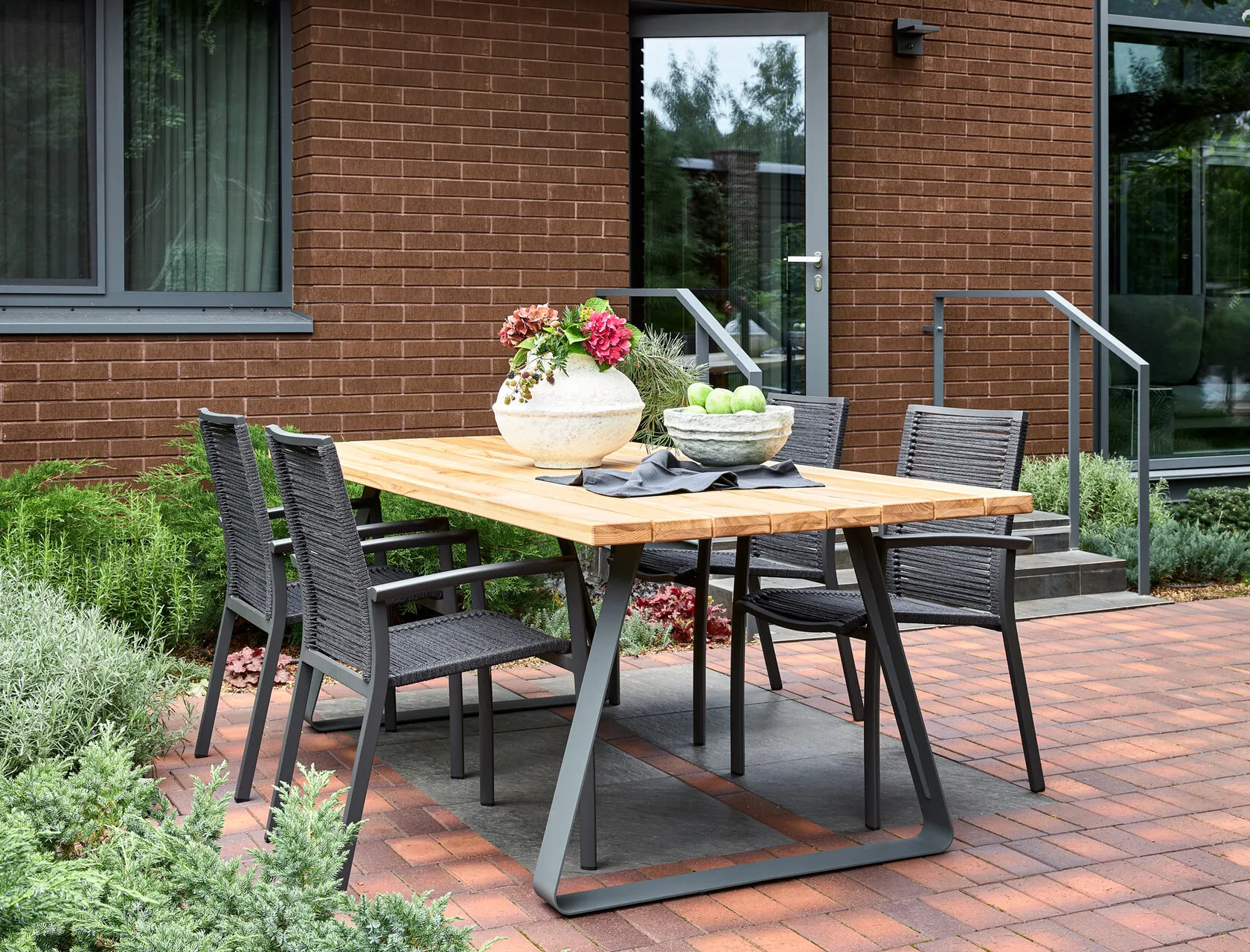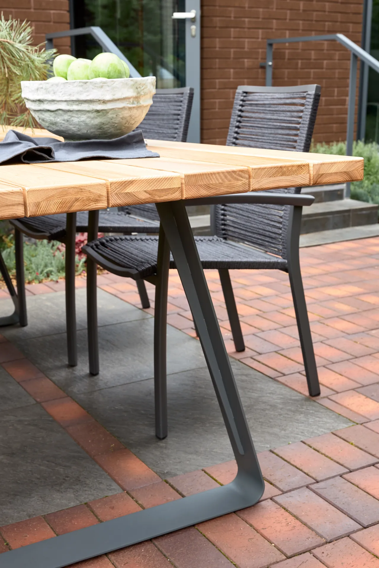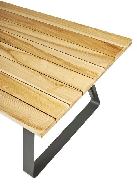 Этот стол представляет собой идеальное сочетание прочности и стиля. Он массивный, устойчивый и обеспечивает достаточно места для большой компании. Порошковое покрытие на металлическом основании делает его долговечным и устойчивым к различным погодным условиям. Столешница из массива ясеня, покрытая корабельным лаком, придает ему естественную красоту, теплоту и возможность использования под открытым небом круглый год.