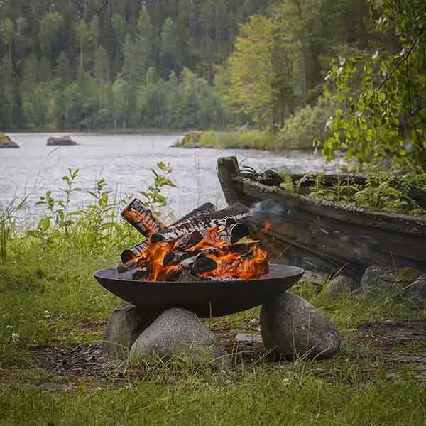 Вы можете самостоятельно придумать и разработать подставку и установить чашу на нее. Чашу можно поставить как на булыжники, так и на специально подготовленное для костровища основание. И в том и в другом случае, она будет эффектно смотреться на вашей даче!