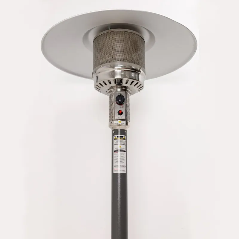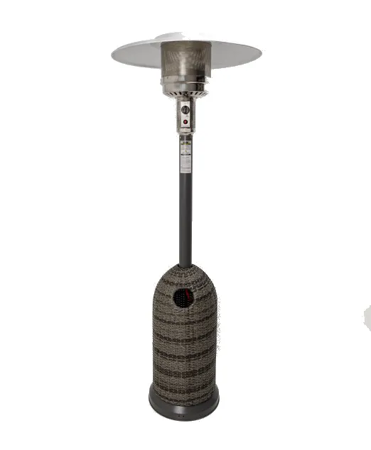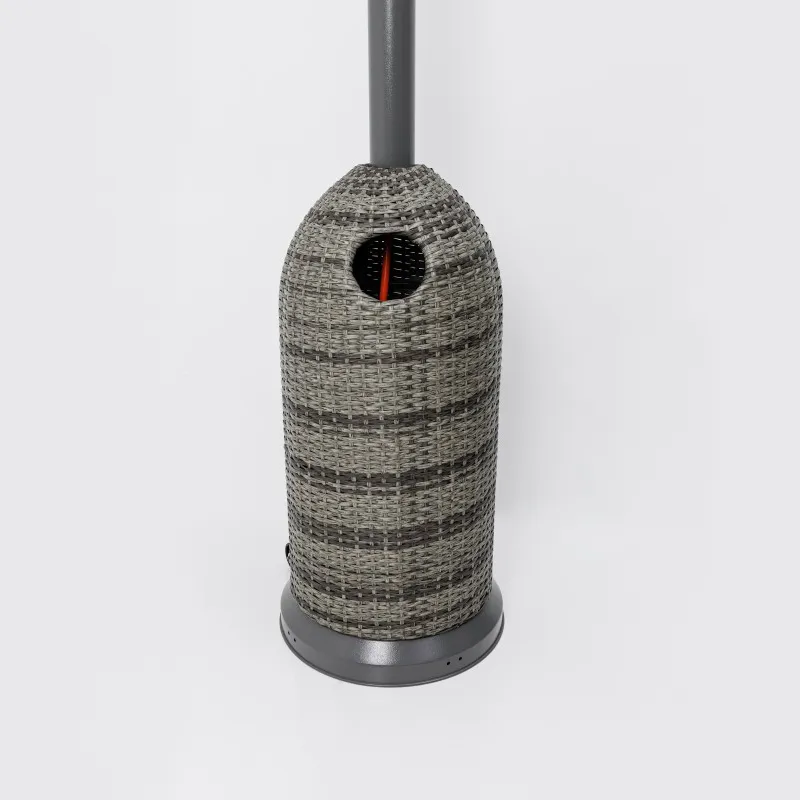 Особое внимание привлекает дизайн в стиле плетёного ротанга — серый текстурированный корпус придаёт обогревателю изысканный вид, идеально вписывающийся в современные ландшафтные и интерьерные решения.