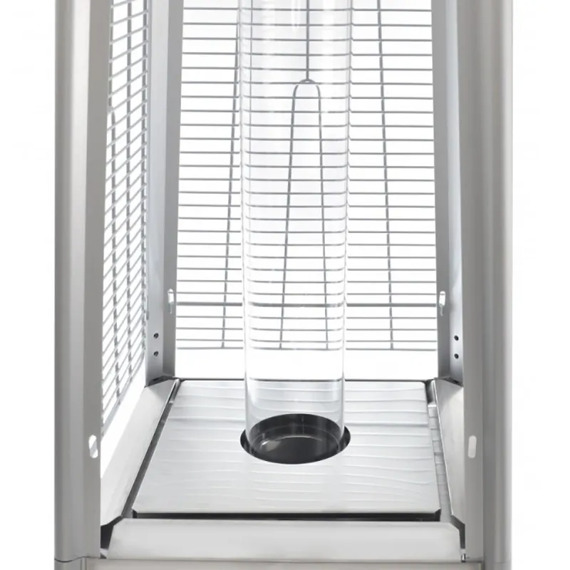 Уличный газовый обогреватель Ställeh Pyramid x 4 Steel, заказать который на нашем сайте можно недорого, представляет собой высокую четырехгранную пирамиду, сверху которой установлен цельноалюминиевый рефлектор-шляпка. Корпус прибора поделен на две части – нижнюю закрытую и верхнюю прозрачную. К основанию прикреплены колесики, обеспечивающие легкое передвижение обогревателя по ровной поверхности.