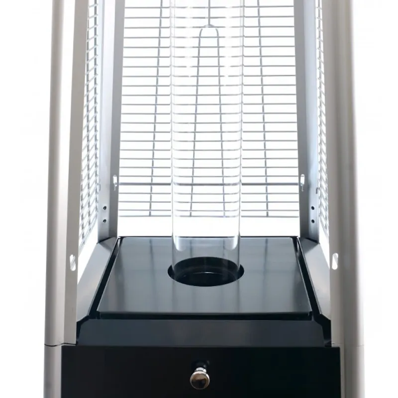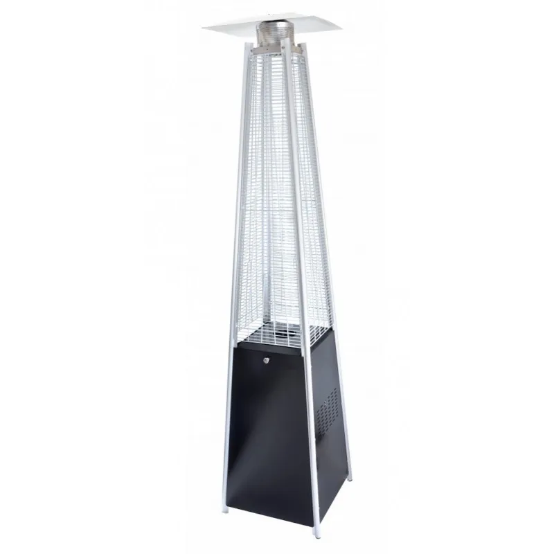 Уличный газовый обогреватель Ställeh Pyramid x 4 Black, заказать который на нашем сайте можно недорого, представляет собой высокую четырехгранную пирамиду, сверху которой установлен цельноалюминиевый рефлектор-шляпка. Корпус прибора поделен на две части – нижнюю закрытую и верхнюю прозрачную. К основанию прикреплены колесики, обеспечивающие легкое передвижение обогревателя по ровной поверхности.