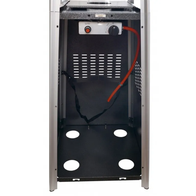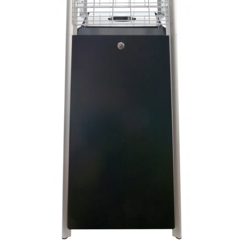 Закрытая часть предназначена для баллона со смесью углеводородных газов (пропан-бутан). Баллон может быть стальным или композитным (пластмассовым). Стальная емкость рассчитана на 27 литров сжиженного топлива, композитная – на 24,5 литра. В прозрачном верхнем отделе находится стеклянная колба из прочного закаленного стекла, по которой во время работы обогревателя поднимается живое пламя. Оно излучает волшебный свет, как от горящего камина. Таким образом обогреватель дает не только тепло, но и мягкое освещение, которого вполне достаточно для вечерних посиделок в хорошей компании или в одиночестве.