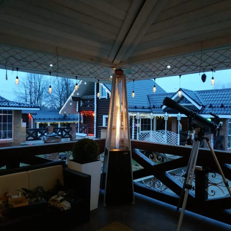 Находясь в зоне действия обогревателя, люди будут чувствовать себя, как в уютном и теплом шатре. При этом на улице может быть даже минусовая температура. Пространство, на которое прибор распространяет тепло и романтический свет, вместит несколько столиков со стульями на открытой веранде кафе или ресторана. Два-три таких устройства привлекут в заведение намного больше посетителей, желающих согреться прохладным вечером и оставить заодно некую сумму за обслуживание.