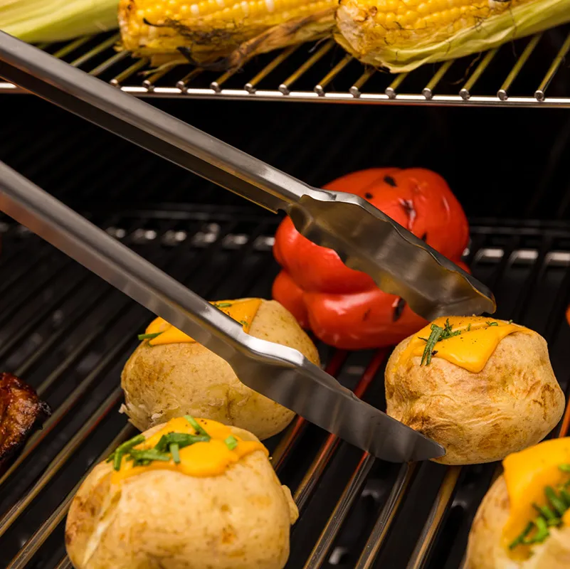 Особенность этих щипцов — комбинированные лезвия: одно — плоское, идеально подходит для аккуратного поддевания рыбы, овощей или тонких стейков; второе — с ребристой поверхностью, обеспечивает надежный захват мяса, колбасок и других продуктов даже при жарке на решетке.
