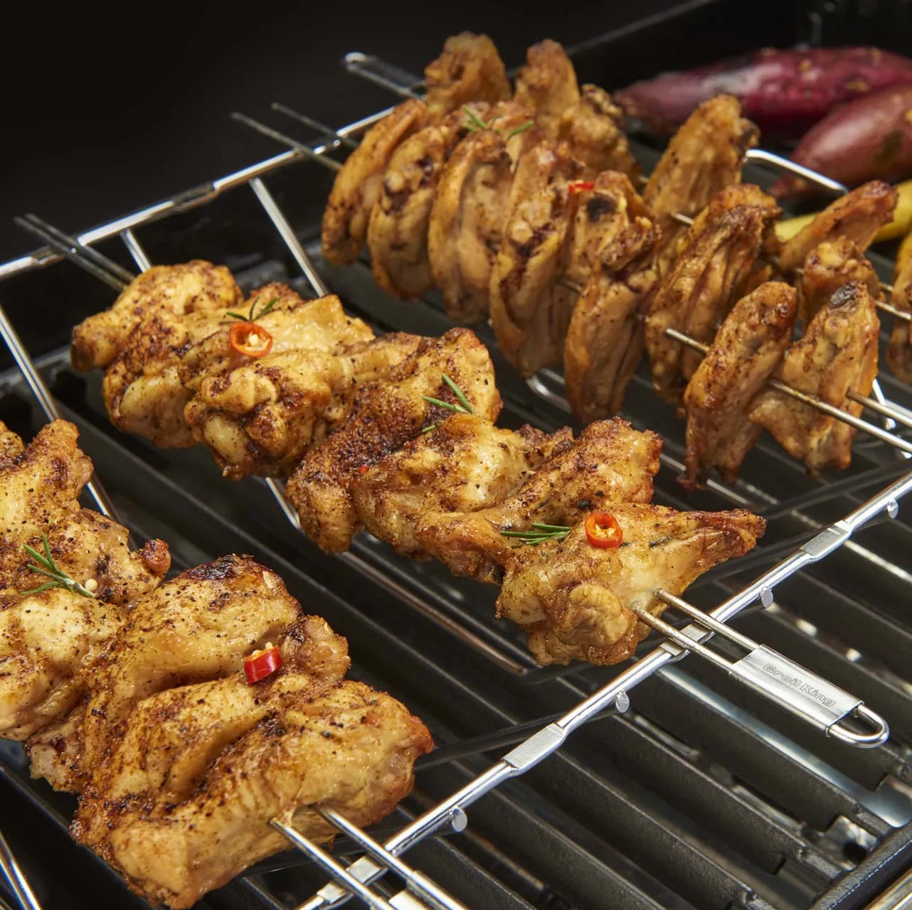 - Равномерное приготовление: V-образная форма удерживает шампуры под оптимальным углом, обеспечивая одинаковый прогрев со всех сторон.