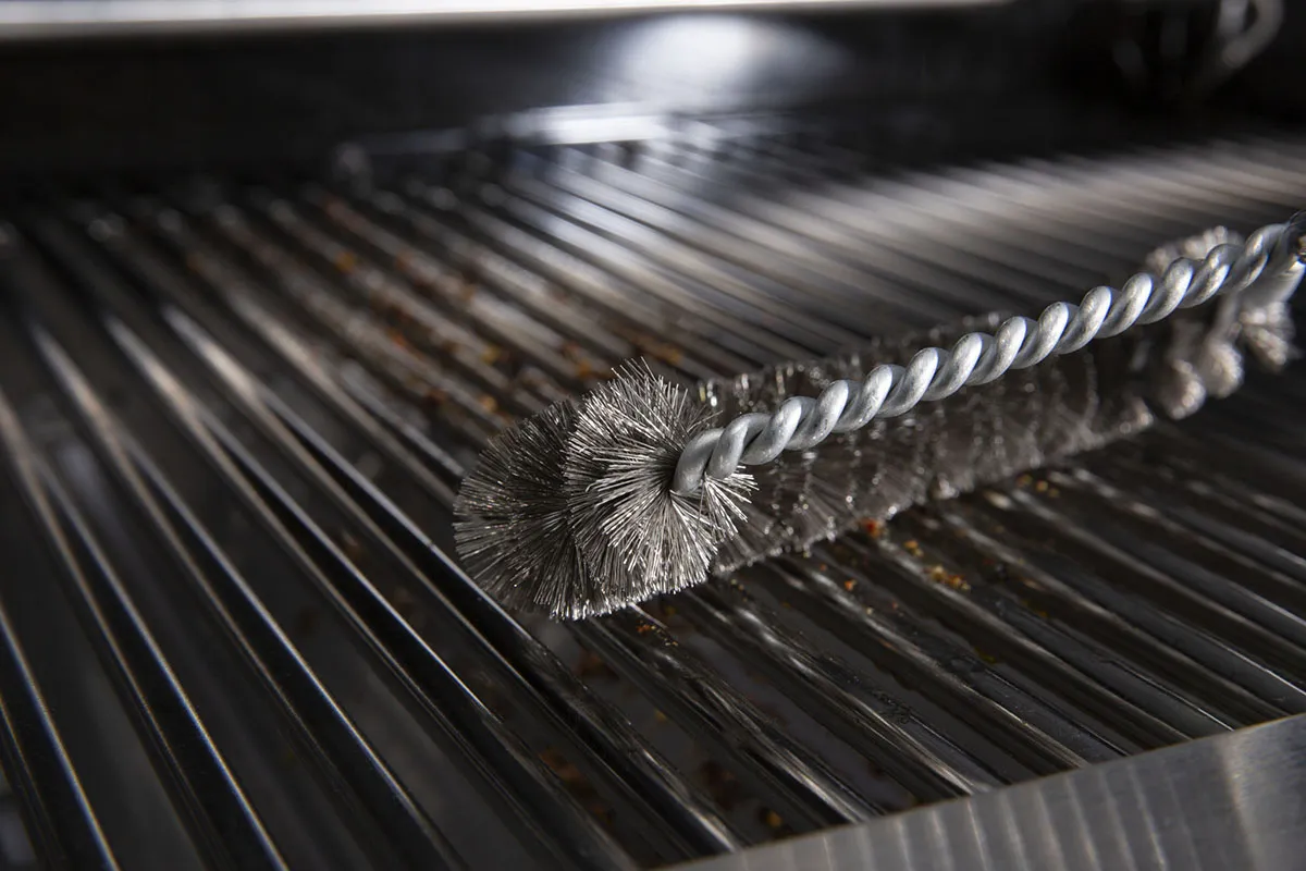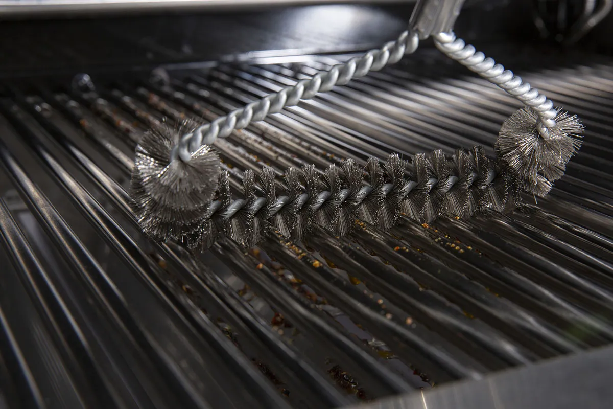 - Жёсткая витая щетина — проникает в труднодоступные зоны между прутьями решётки и в углах гриля;