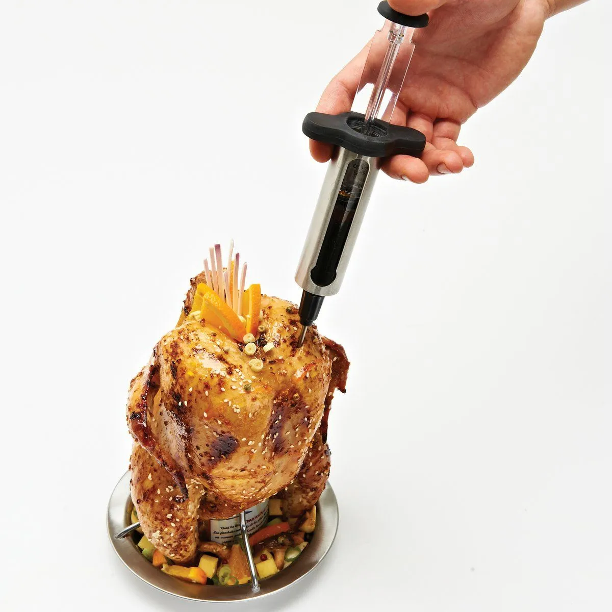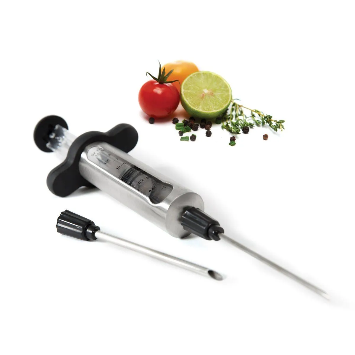 Отличный аксессуар для придания мясу особого вкуса. В набор входит две иглы – большая и маленькая, а прозрачная мерная шкала покажет точное количество вводимого маринада. Шприц разбирается для удобной чистки.