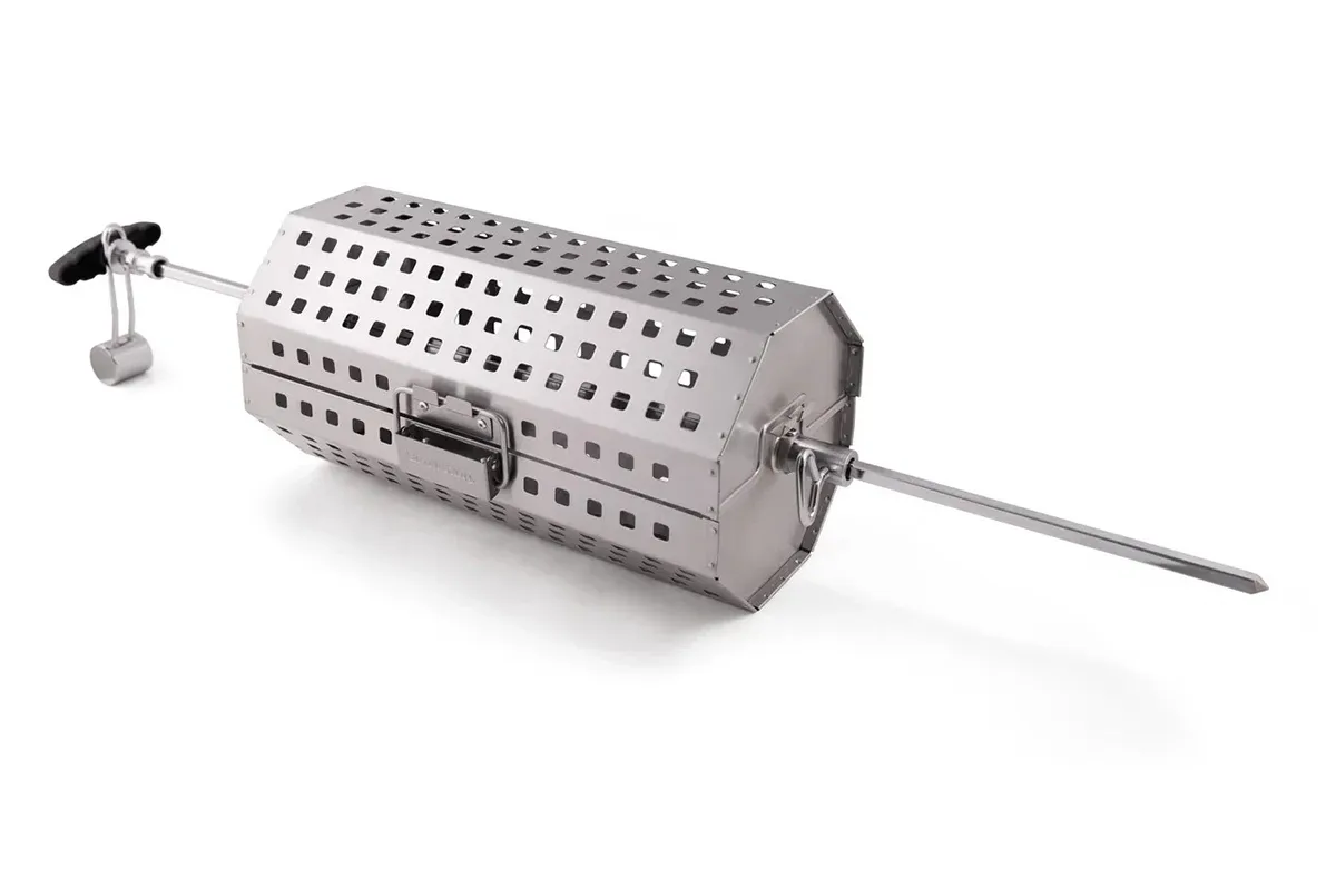- Решетчатая корзина из перфорированной нержавеющей стали надевается на вертельный стержень.