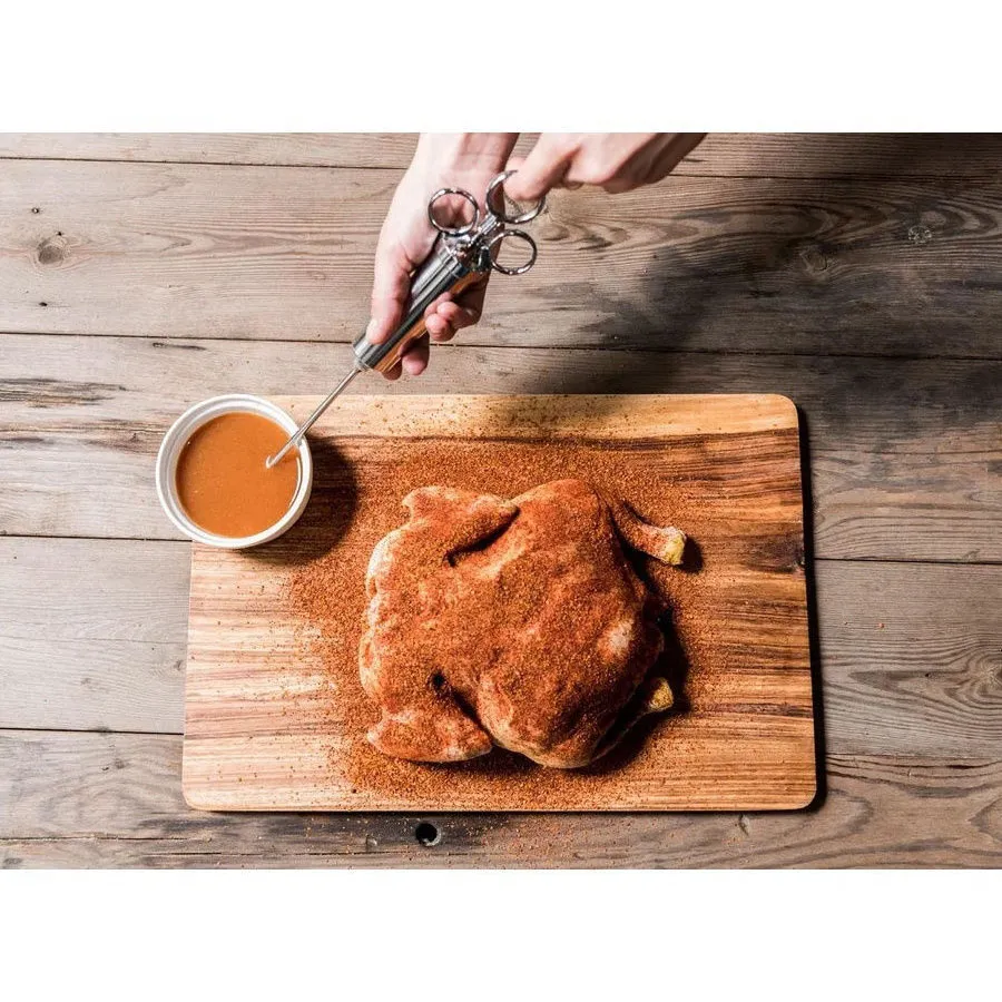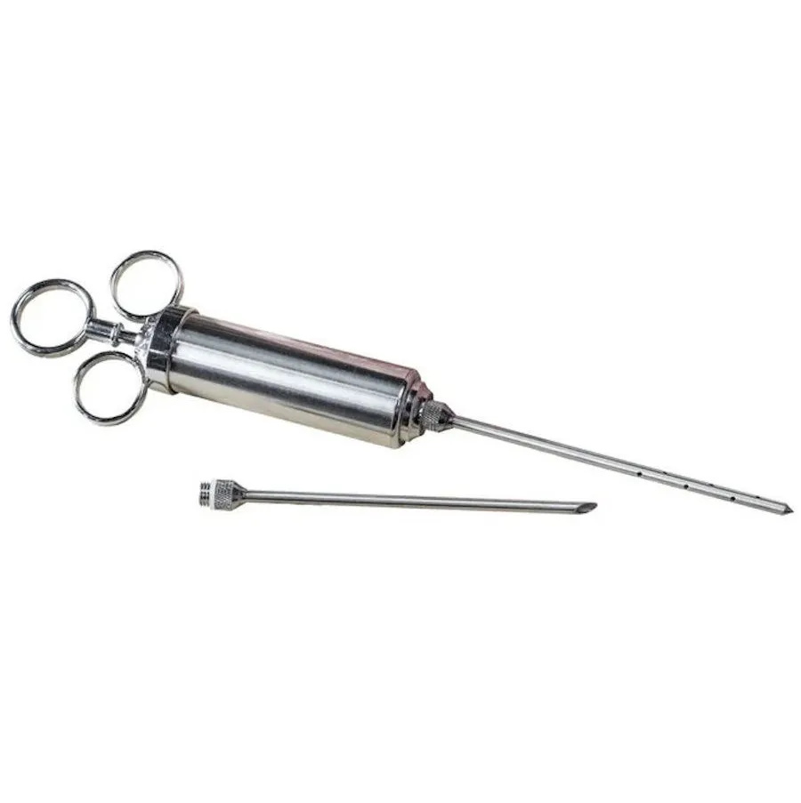 Прочная конструкция из нержавеющей стали. Объем 60 мл. Легко разбирается для чистки. Насадка с одной или мульти иглами для маринада.