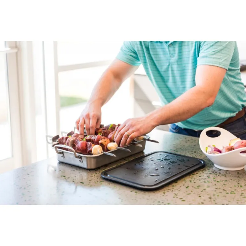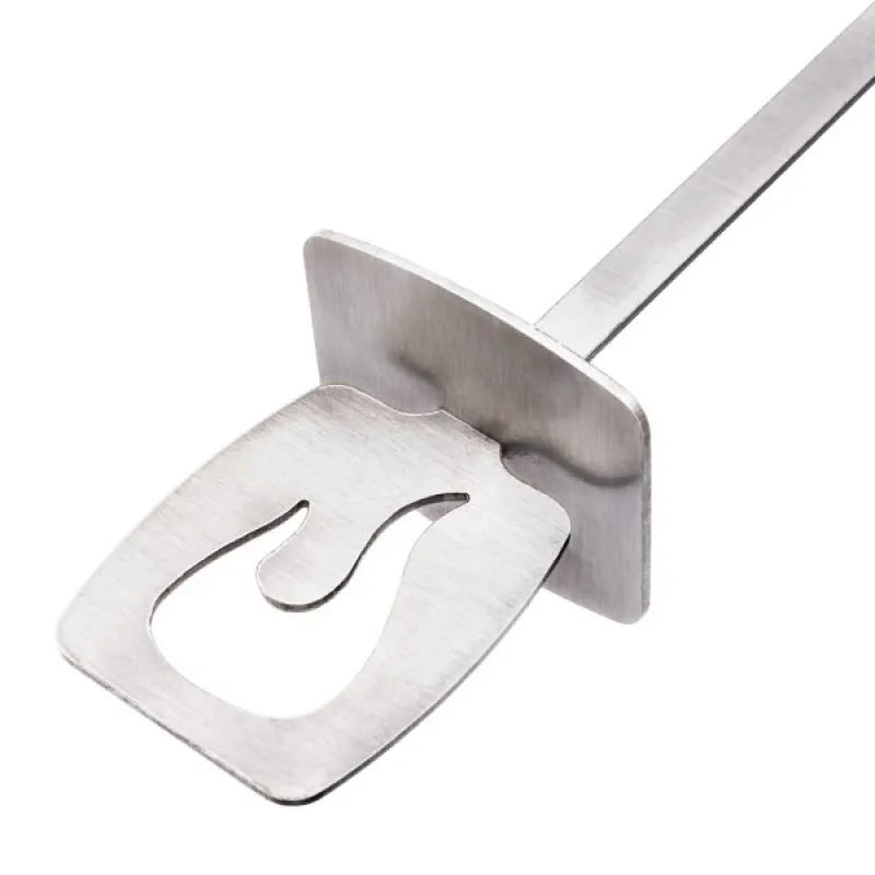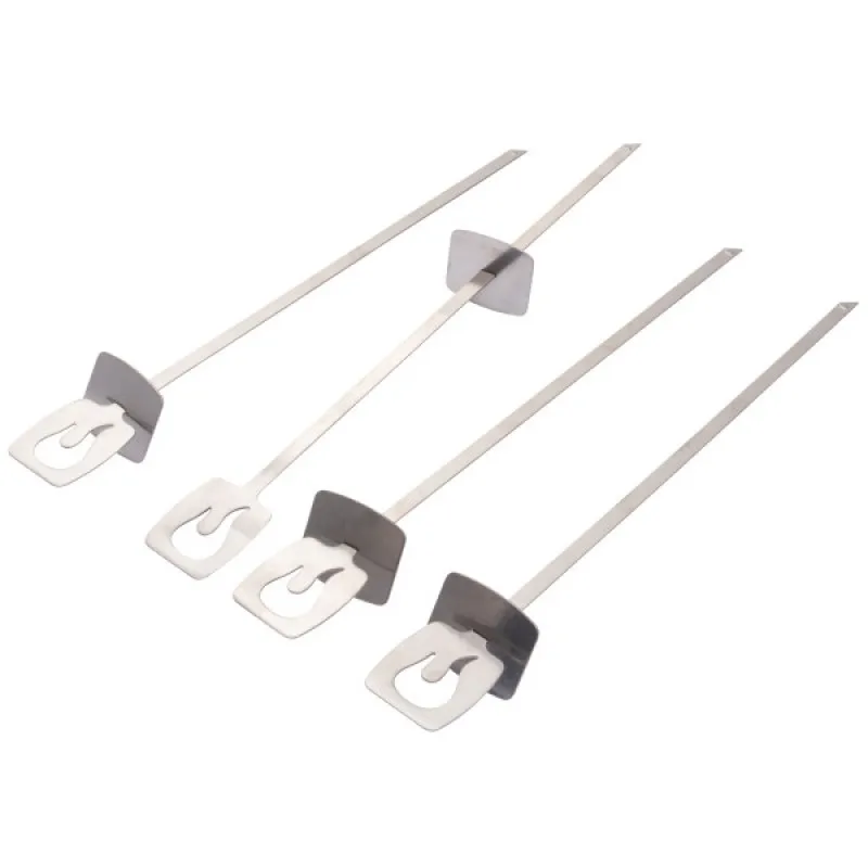 Набор из 4 плоских стальных шампуров, снабженных сдвигающейся насадкой для легкого съема кусочков с шампура. Входит в фирменную систему аксессуаров Grill+.