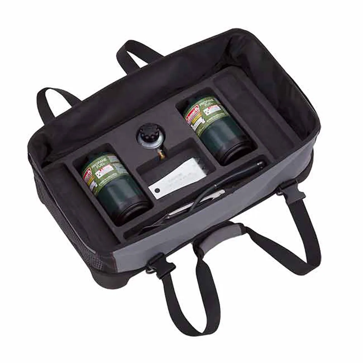 Внутри предусмотрены специальные отсеки для двух 0,5-литровых газовых баллонов и редуктора, что позволяет перевозить всё необходимое в одном месте — аккуратно, компактно и без риска повреждения оборудования. Продуманная конструкция защищает гриль от ударов, пыли и царапин, а удобные ручки обеспечивают комфорт при переноске.
