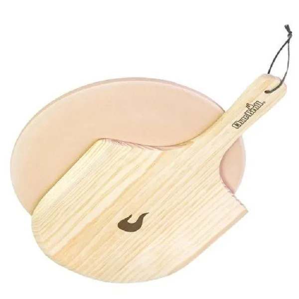 Классический набор для выпекания пиццы, состоящий из камня и деревянной лопатки.