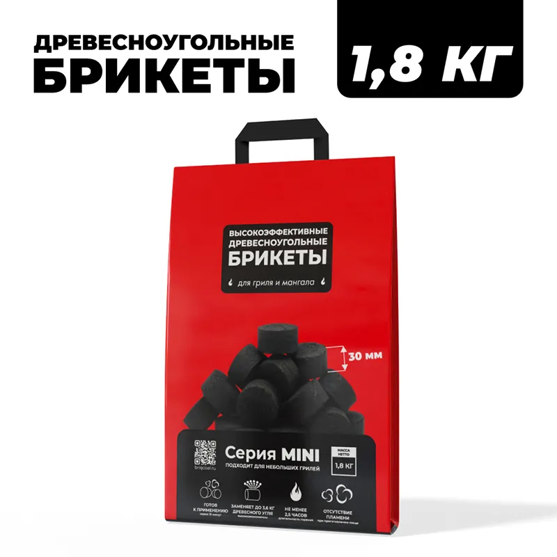 - Эффективность: 1,8 кг BriqMINI заменяют до 3,6 кг обычного древесного угля;