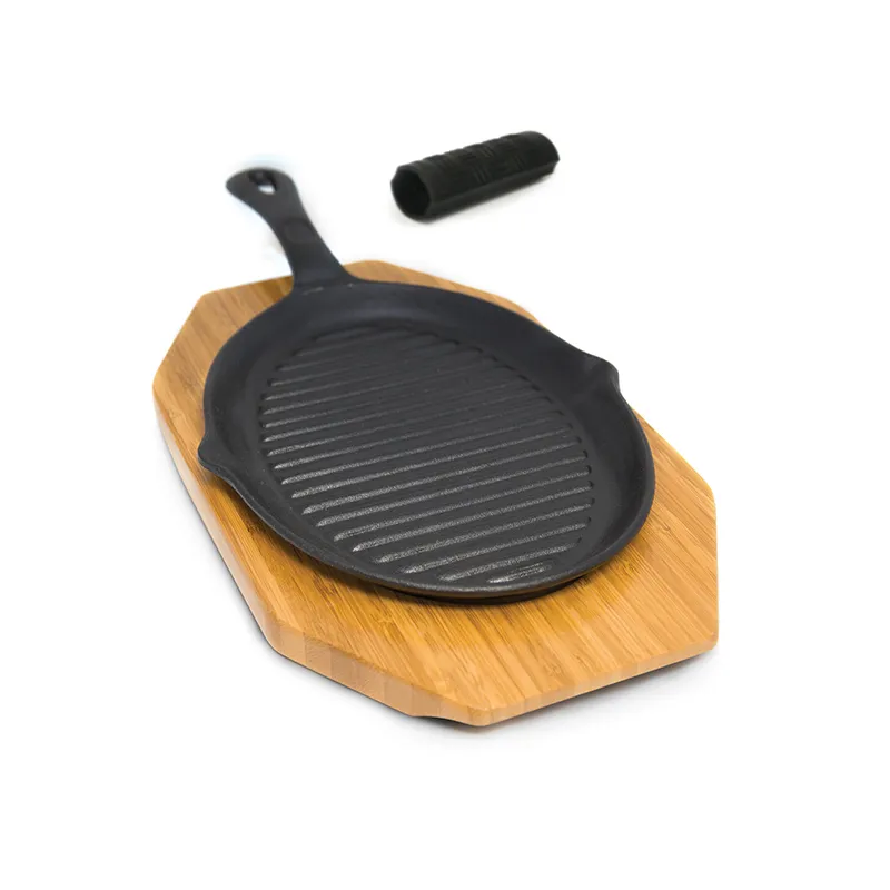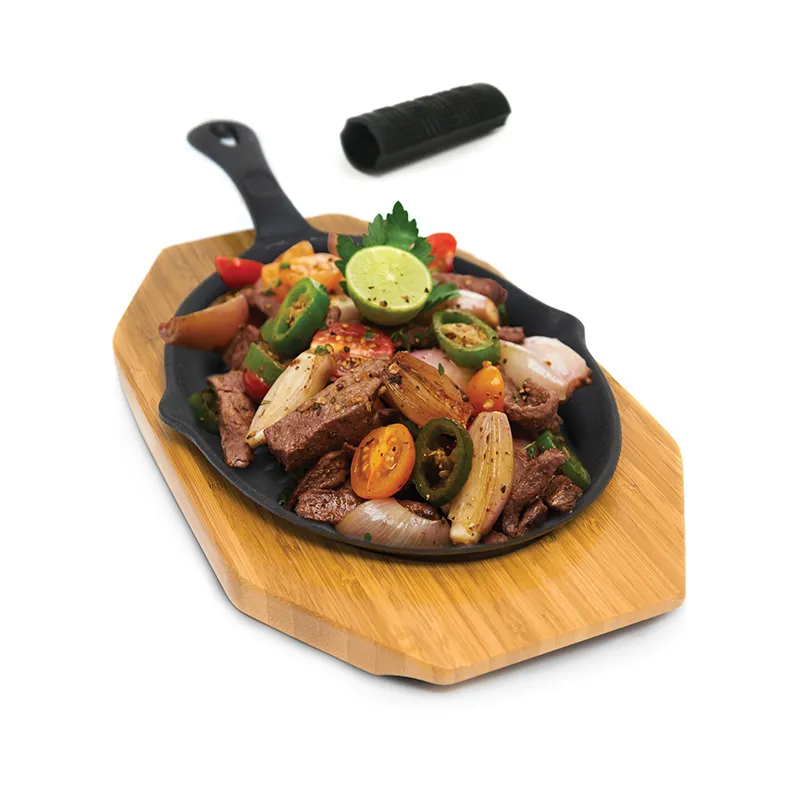 Прочная чугунная сковорода для приготовления фахитас и других жареных блюд на гриле. Набор включает в себя бамбуковое основание и силиконовый чехол на ручку для удобного и безопасного переноса сковороды.Размеры: