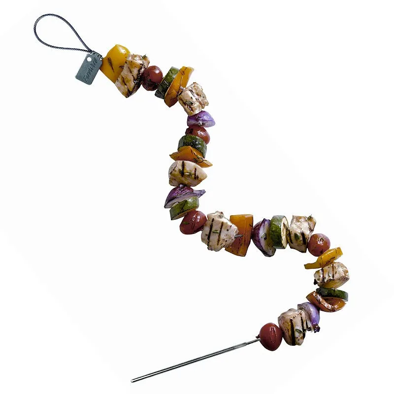 Практичное усовершенствование традиционного шампура. Больше Вам не придется переворачивать каждый кусочек отдельно! Благодаря гибкости стального троса, шампуру можно придать любую форму, что позволит задействовать практически всю поверхность решетки гриля. Каждый шампур состоит из штифта и длинного провода с закрытой петлей. Вы можете легко соединить кусочки рыбы, мяса, птицы или овощей без опасений, что небольшой кусочек провалится сквозь решетку вниз на уголь.