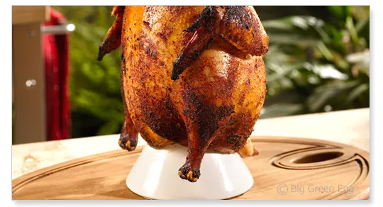 Керамическая подставка для индейки поможет Вам идеально приготовить птицу. Налейте соус, вино или добавьте ароматные травы и специи в подставку, сверху насадите индейку и разместите в Big Green Egg (для стекающего сока используйте круглый поддон для сбора капель). Готовое мясо получается нежным, пропитывается ароматами приправ и приобретает хрустящую корочку.